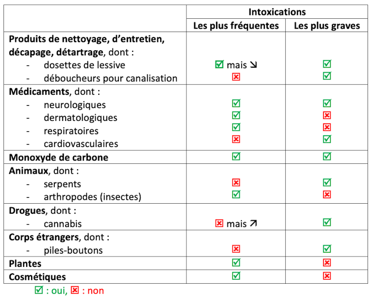 Tableau : Intoxications accidentelles pédiatriques les plus fréquentes et les plus graves (Source : Anses, 2023. Expositions accidentelles à des toxiques chez les enfants. Étude des données à partir de plusieurs sources de recours aux soins entre 2014 et 2020, saisine 2020-SA-0084)
