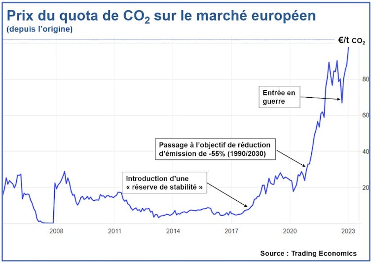 Lorsque la Russie a envahi l’Ukraine en février 2022, les prix de l’énergie se sont envolés. Celui du quota de CO2 sur le marché européen du carbone a perdu un bon tiers de sa valeur. Certains ont alors cru que le système n’allait pas résister à la flambée des prix énergétiques.