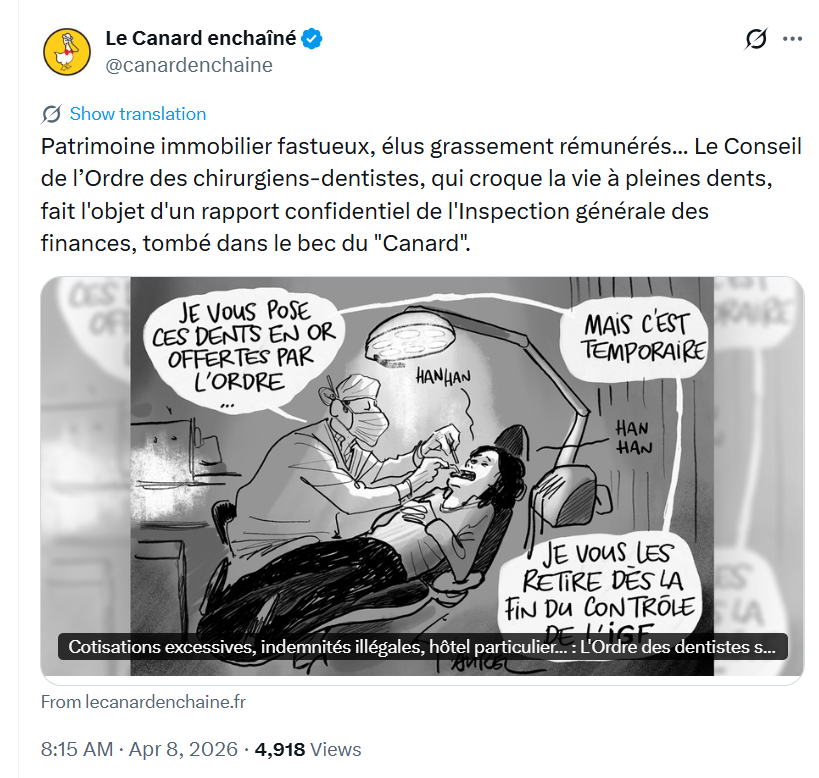 Mise à jour 8 avril 2026 : ajout de l’alerte du Canard Enchaîné sur l’Ordre des chirurgiens-dentistes